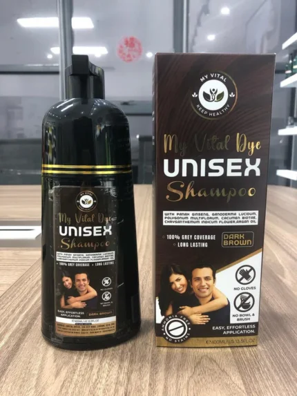 Transform your hair coloring routine with My Vital Dye Unisex Hair Color Shampoo, a fast-acting and easy-to-use solution for covering grey hair naturally. This innovative shampoo combines premium herbal ingredients—including panax ginseng, ganoderma lucidum, polygonum multiflorum, cacumen biotae, chrysanthemum indicum flower, and argan oil—to deliver beautiful color while deeply nourishing the hair and scalp.