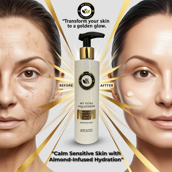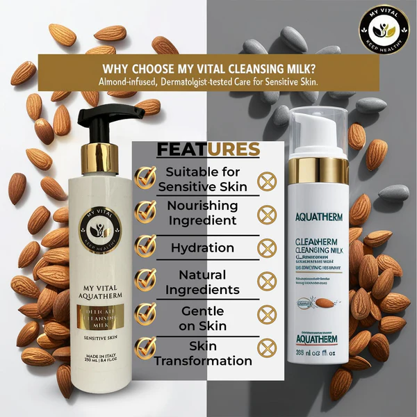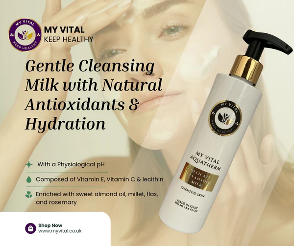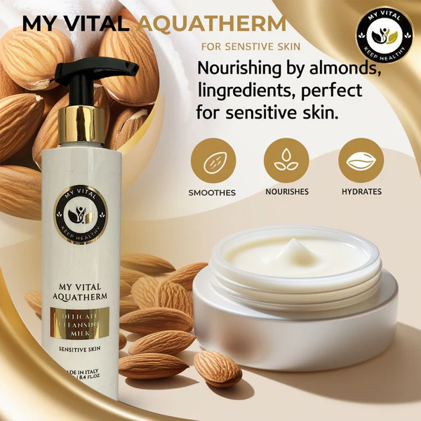 My Vital Aquatherm Cleansing Milk is a gentle, hydrating cleanser made for sensitive skin. It removes makeup, dirt, and impurities while keeping the skin soft, calm, and moisturized.