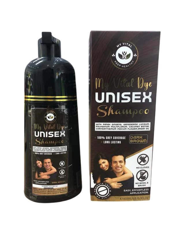 Transform your hair coloring routine with My Vital Dye Unisex Hair Color Shampoo, a fast-acting and easy-to-use solution for covering grey hair naturally. This innovative shampoo combines premium herbal ingredients—including panax ginseng, ganoderma lucidum, polygonum multiflorum, cacumen biotae, chrysanthemum indicum flower, and argan oil—to deliver beautiful color while deeply nourishing the hair and scalp.
